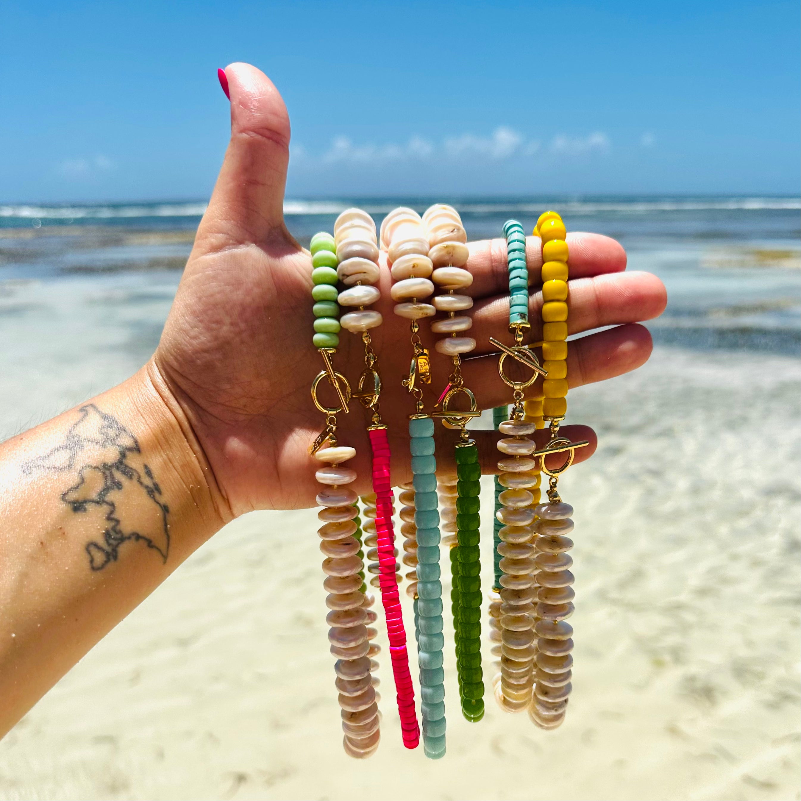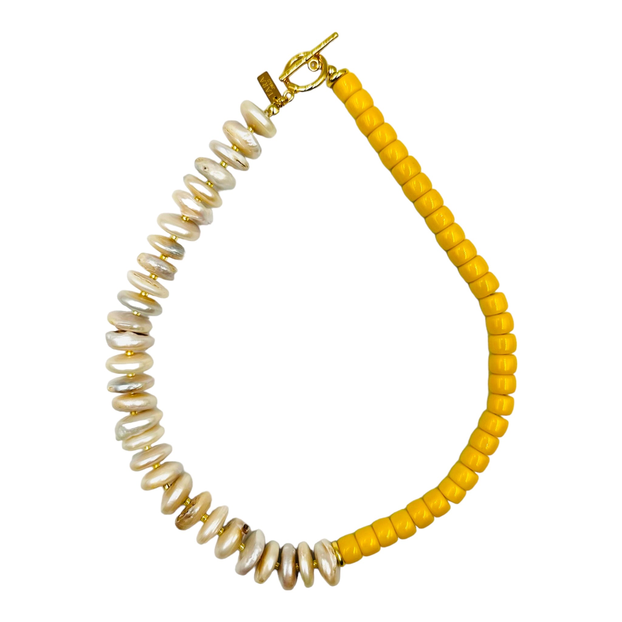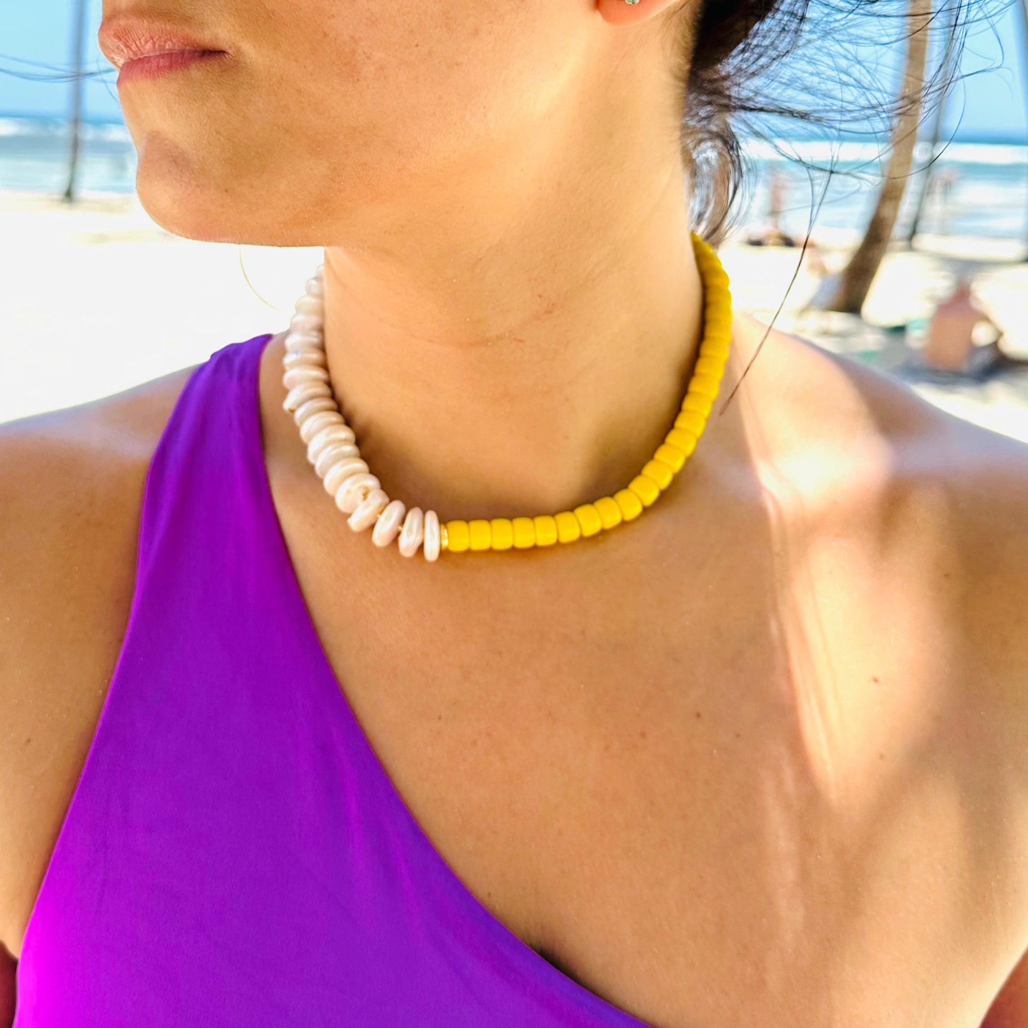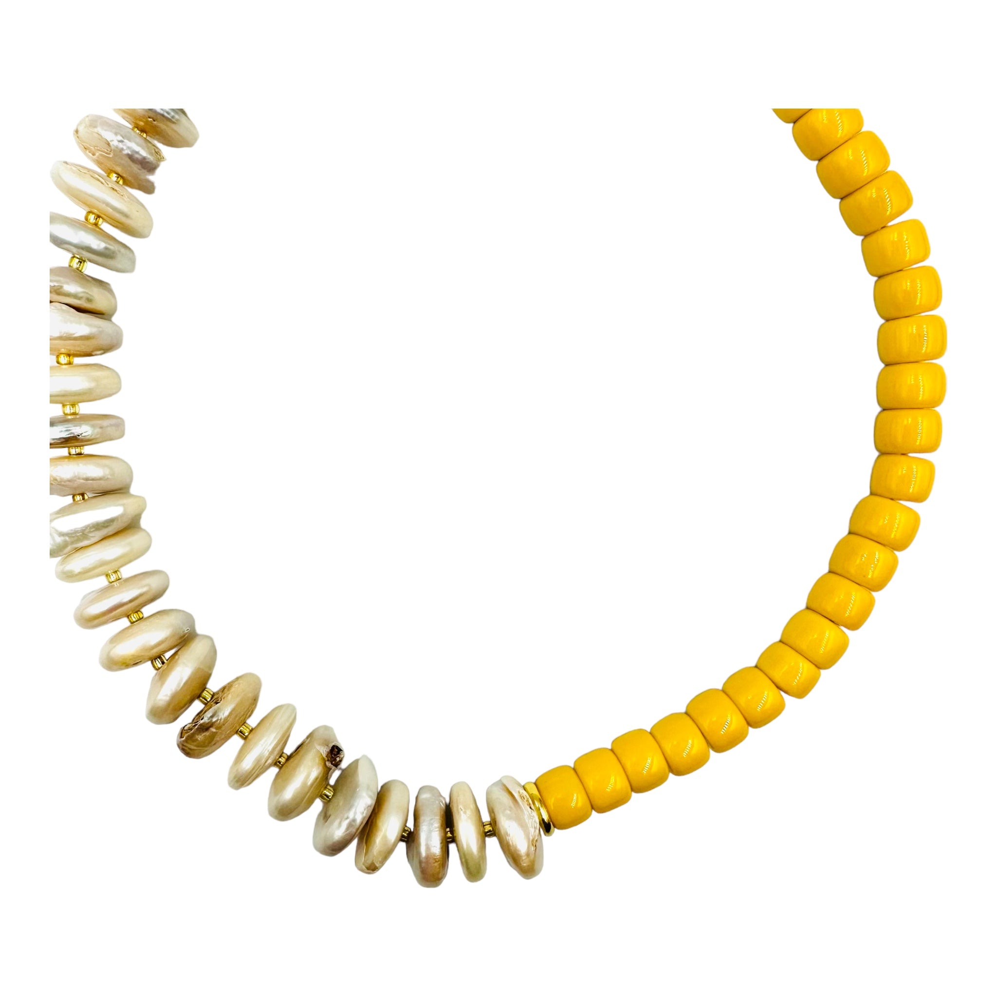 Faites-vous belle avec ce ravissant collier composé de pierres colorées et de perles d'eau douce. Réalisé à la main, il évoque à la fois la chaleur du soleil et la fraîcheur d'un parfum citroné.